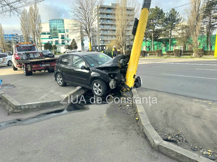 FOTO-VIDEO Accident rutier în Mamaia, pe sensul de mers Constanța-Năvodari. Un șofer a intrat cu mașina într-un stâlp de iluminat