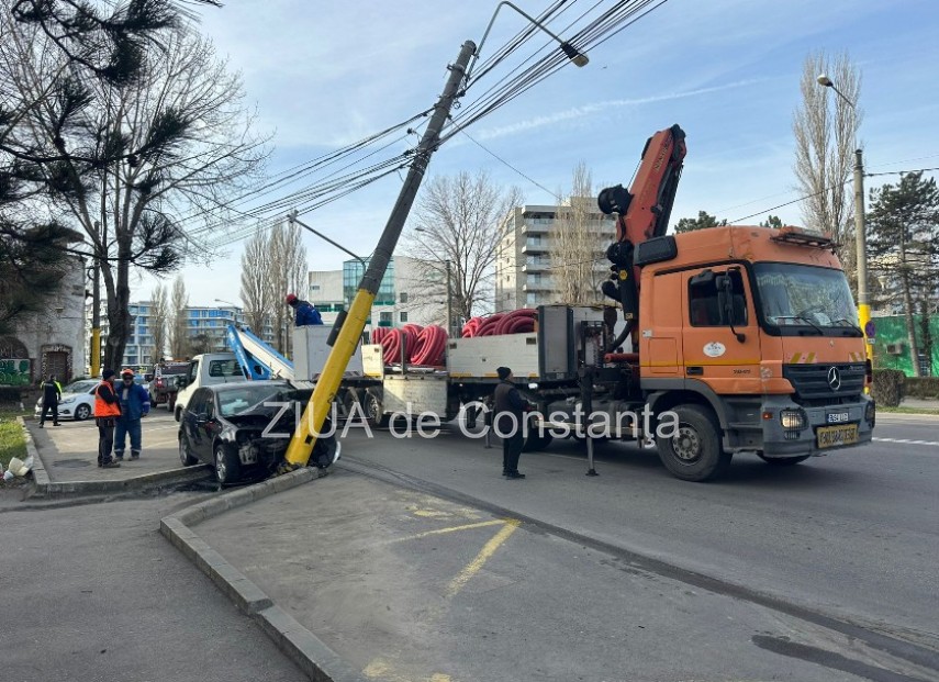Stâlpul de iluminat, lovit în plin de mașină, s-a rupt de la bază și s-a înclinat periculos peste cablurile de electricitate și deasupra șoselei.