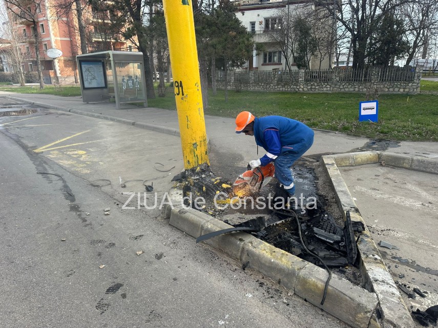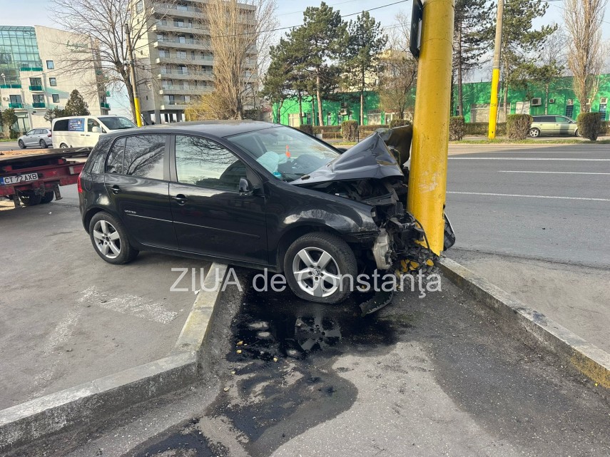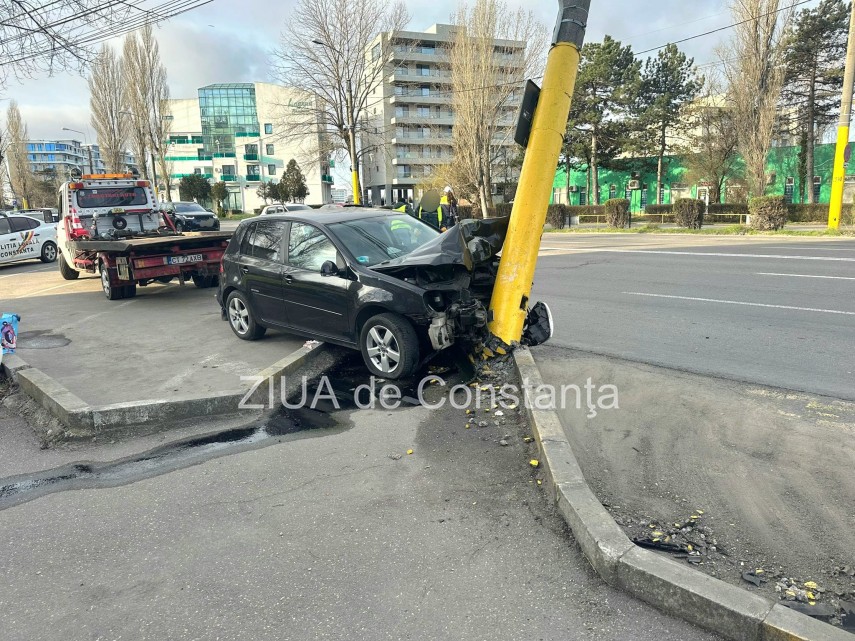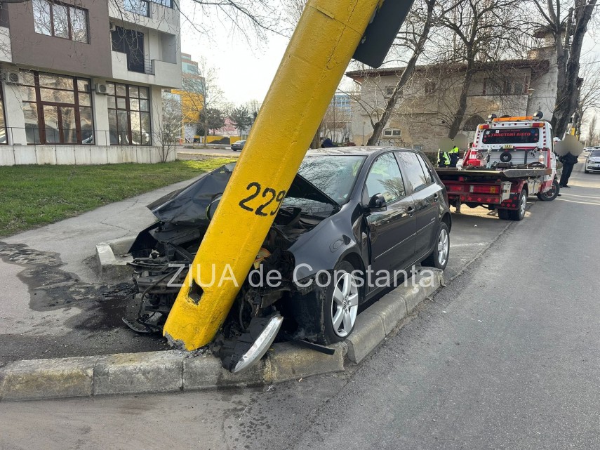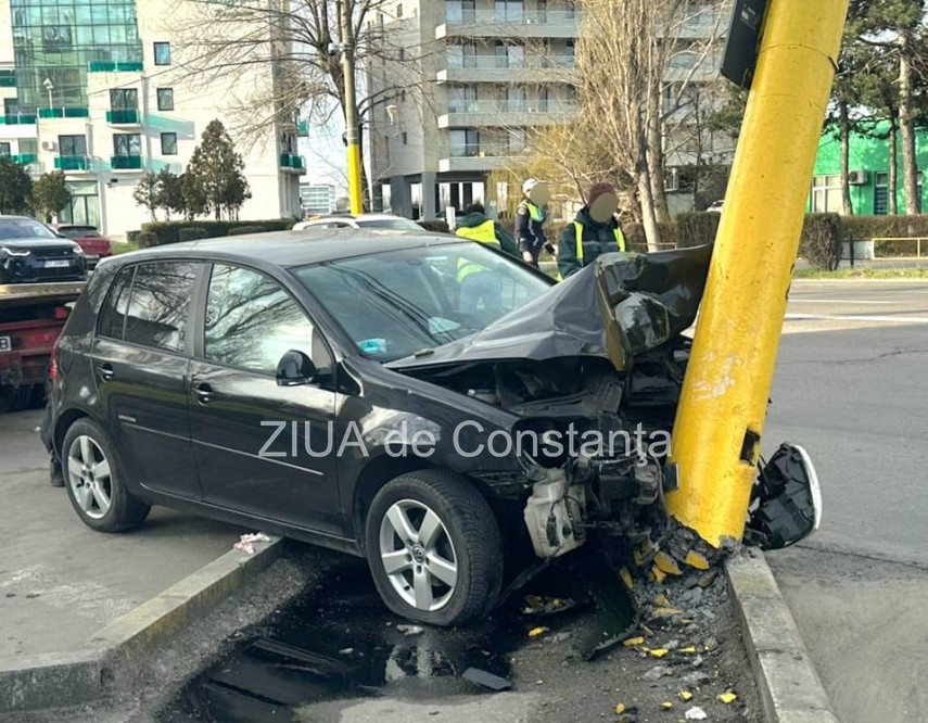 FOTO-VIDEO Accident rutier în Mamaia, pe sensul de mers Constanța-Năvodari. Un șofer a intrat cu mașina într-un stâlp de iluminat