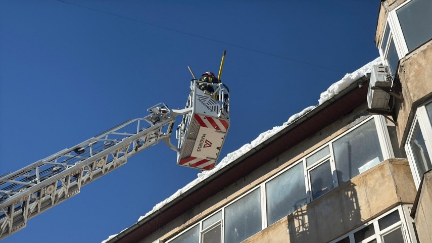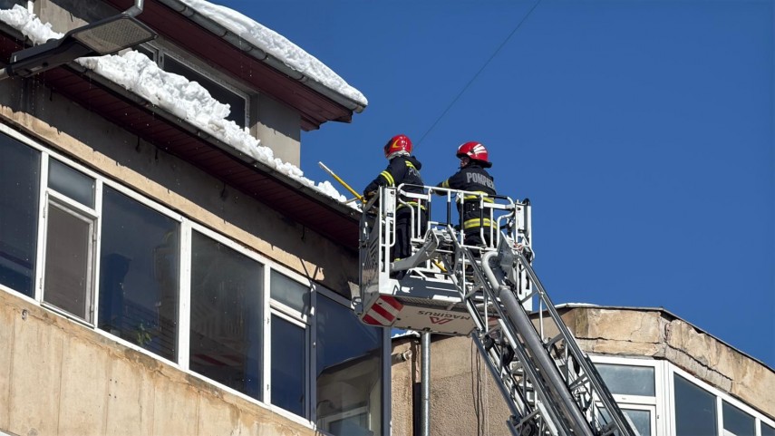FOTO+VIDEO: Zăpada de pe acoperișul unui bloc din Tulcea amenință siguranța trecătorilor. Pompierii acționează