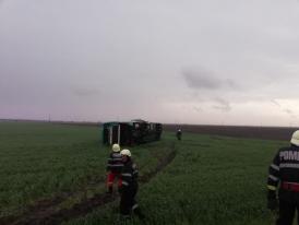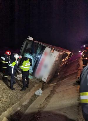 UPDATE. Județul Constanța: Un autocar s-a răsturnat la intrare în localitatea Siminoc