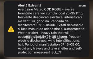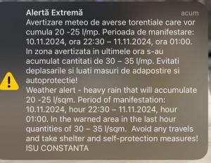 Meteorologii au anunțat un cod galben de instabilitate atmosferică în perioada 4 noiembrie, ora 10.00-23.00, în Dobrogea, cea mai mare parte a Munteniei și în jumătatea sudică a Moldovei, vor fi perioade cu instabilitate atmosferică ce se va manifesta prin intensificări ale vântului cu rafale de 55...65 km/h, izolat vijelii puternice (rafale de peste 70 km/h), averse moderate cantitativ, descărcări electrice și izolat grindină.
