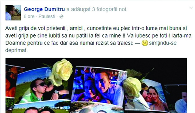Mesajul este însoţit de trei fotografii ce reprezintă un colaj de imagini în care George Dumitru apare alături de o tânără, iar una dintre fotografiile postate pe reţeaua de socializare a fost găsită în maşina bărbatului în momentul în care a avut loc accidentul.