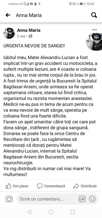 „Iubitul meu, Matei Alexandru Lucian, a fost implicat într-un grav accident cu motocicleta, a suferit multiple leziuni, are patru coaste şi coloana ruptă , nu îşi mai simte corpul de la brâu în jos.