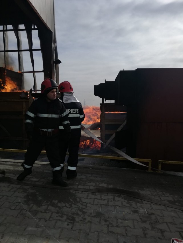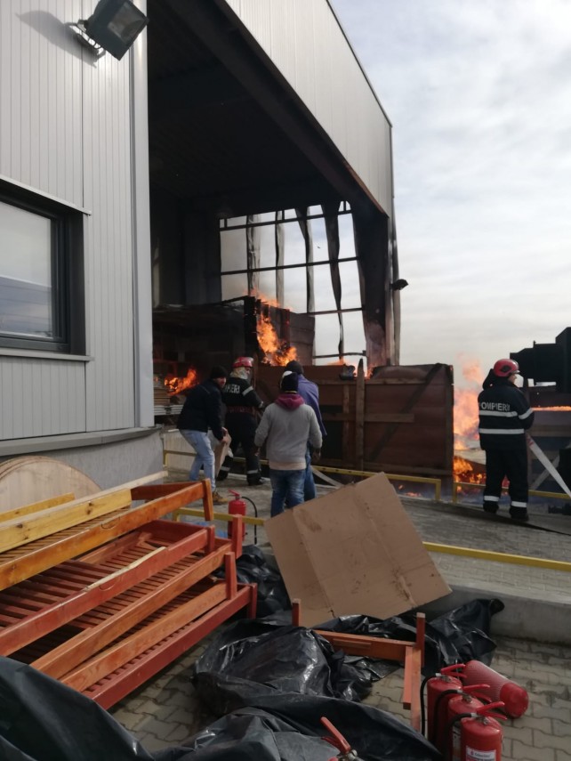 Pompierii constănțeni intervin la stingerea unui incediu la o fabrică de mobilă, la ieșire din Ovidiu (video)