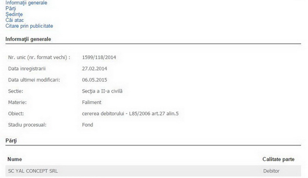 „La termenul din data de 6.05.2014, în dosarul de insolvenţă 1599/118/2014, s-a judecat cererea de schimbare a ADMINISTRATORULUI JUDICIAR BÂRLĂDEANU ALEXANDRU - VITALI formulată de administratorul special al SC YAL CONCEPT SRL, d-na Mihaela Zamoiani, şi de Administratorul statutar, d-nul Lucian George Radu. Datorită neîndeplinirii procedurii de citare a tuturor membrilor comitetului creditor al societăţii, cât şi a constatării lipsei calităţii procesuale active a d-nului Lucian George Radu, termenul de judecare al cererii s-a amânat pentru dată de 20.05.2015. Facem menţiunea că la dosarul de insolvenţă 1599/118/2014 nu s-a formulat nicio cerere de intrare în faliment, intenţia conducerii societăţii fiind aceea de Reorganizare“.