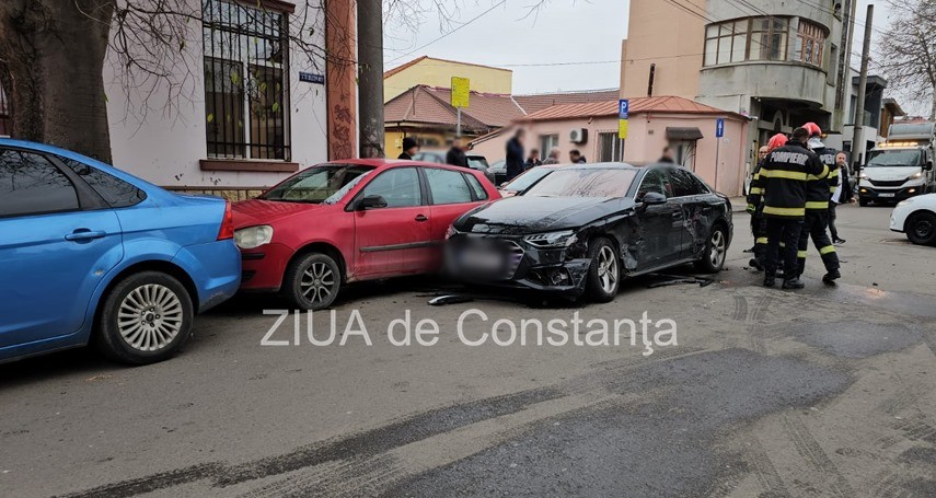 Din primele informații, după coliziunea dintre un autoturism Opel Astra și un Audi A4, cel de-al doilea autoturism a ricoșat în alte două mașini parcate.