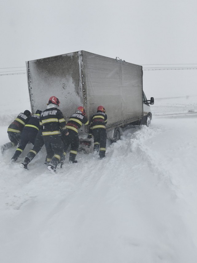 În timp ce se întorceau de la o intervenție din județul Tulcea, pompierii au observat o dubă rămasă înzăpezită pe marginea drumului. Fără să stea pe gânduri, au oprit și au intervenit prompt pentru deblocarea autovehiculului. Datorită profesionalismului și determinării lor, șoferul și-a putut continua deplasarea în siguranță.