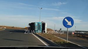 Astfel, un tir încărcat cu fructe s-a răsturnat la sensul giratoriu din Ovidiu, unde se urcă pe autostradă.