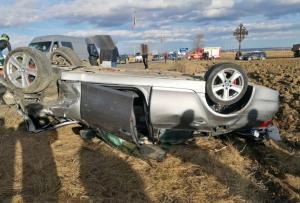 Șoferul a pierdut controlul volanului și a ieșit în decor, răsturnându-se în rigola de la marginea șoselei.