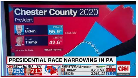 Joe Biden 264 – Donald Trump 214. Pentru a câștiga oricare dintre candidați are nevoie de minimum 270 de voturi electorale (electori)