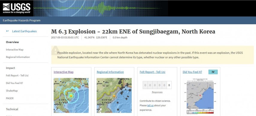 USGS.GOV apreciază cutremurul ca fiind de magnitudine 63.3 iar agențiile de presă internațională apreciază ca fiind un test nuclear în zonă.