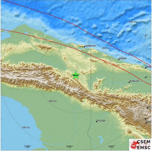 Conform specialiștilor seismul a avut epicentrul la 978 km de Port Moresby, Papua New Guinea, 159 km de Jayapura, Indonesia și 145 km de Abepura, Indonesia.