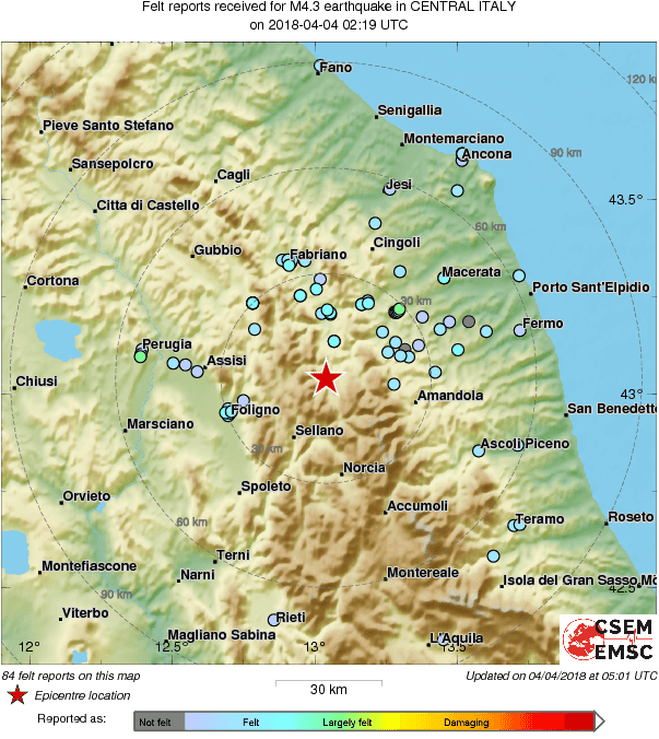 Distanţele de la epicentru la cele mai apropiate oraşe: 135 km N de Roma, Italia, 54 km E de Perugia, Italia, 43 km SV de Macerata, Italia, 38 km N de Maltignano, Italia.