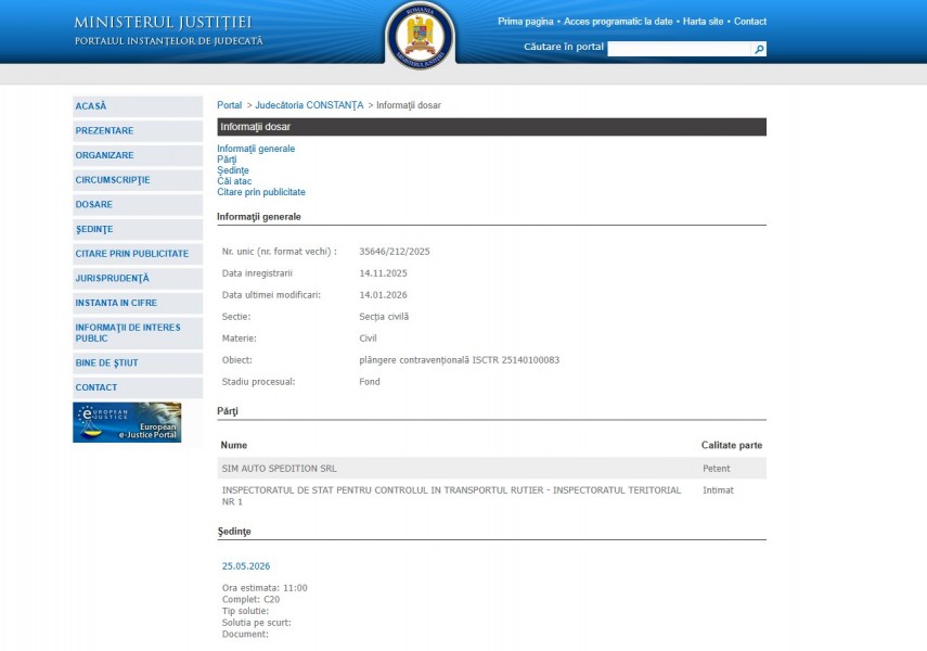 Pe rolul Judecătoriei Constanța a fost înregistrat la data de 14 noiembrie 2025 a fost înregistrat dosarul 35646/212/2025 în care părți sunt Sim Auto Spedition SRL - pârât și Inspectoratul de Stat Pentru Controlul în Transportul Rutier - Inspectoratul Teritorial Nr 1- intimat.Dosarul are ca obiect plângere contravenţională ISCTR 25140100083.