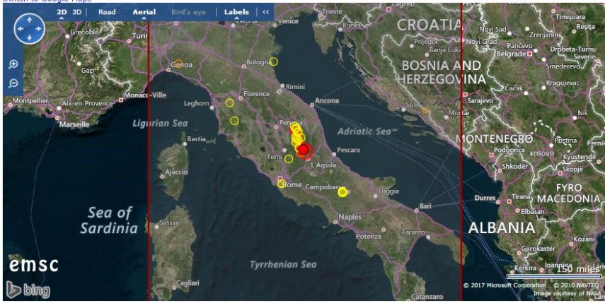 Potrivit Centrului Seismologic Euro-Mediteranean cutremurele au avut loc în zona coordonatelor 42.53 N/13.28 E la 96 km NE de Roma și 22 km NV de L’Aquila.