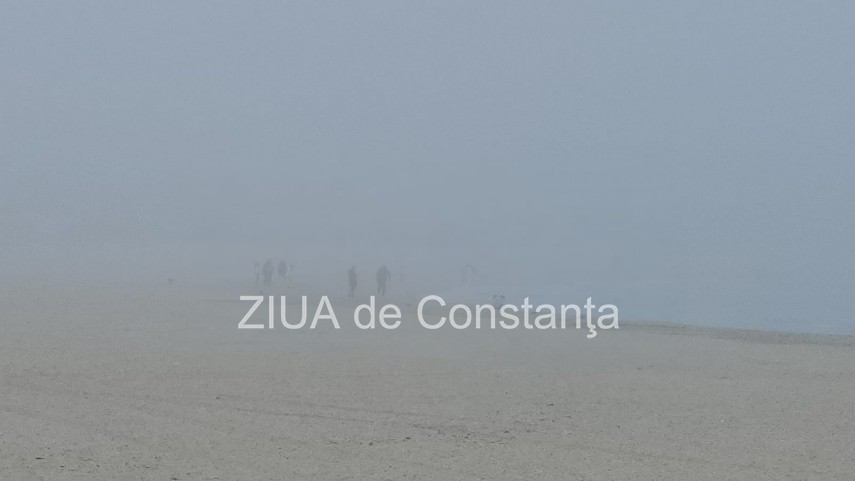 Vizibilitatea redusă a făcut ca marea să pară că se pierde în orizont, iar siluetele oamenilor care se plimbă pe nisip abia se mai disting.