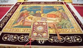 Pe aceasta este un epitaf pe care este reprodusă icoana punerii în mormant a lui Iisus Hristos, Evanghelia și Crucea.