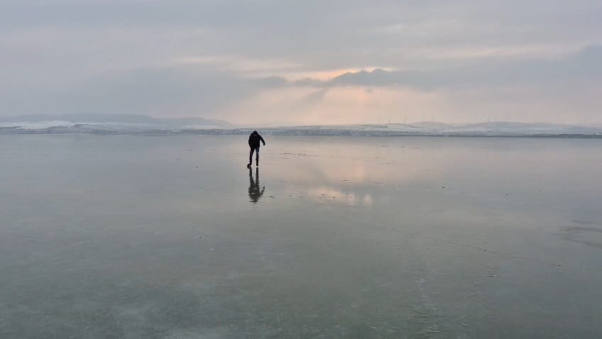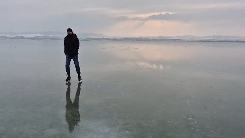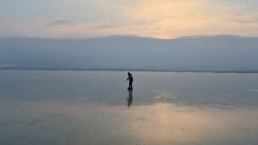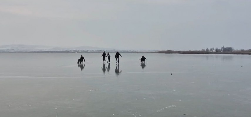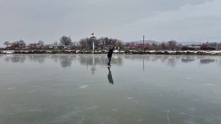 FOTO+VIDEO: Gerul transformă Lacul Zebil într-un patinoar natural spectaculos, în județul Tulcea