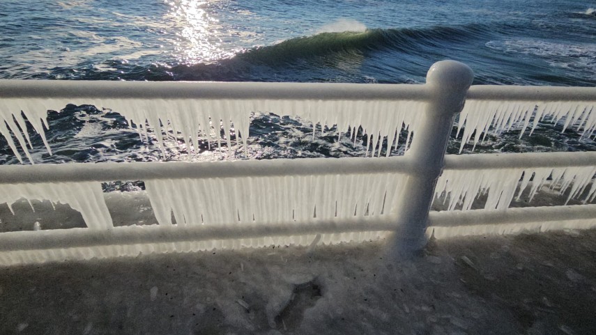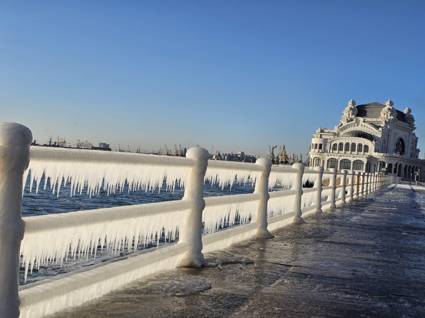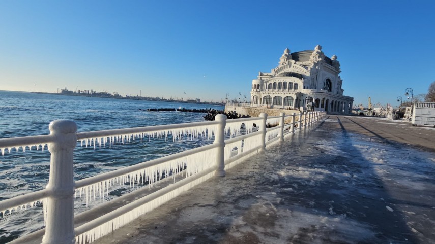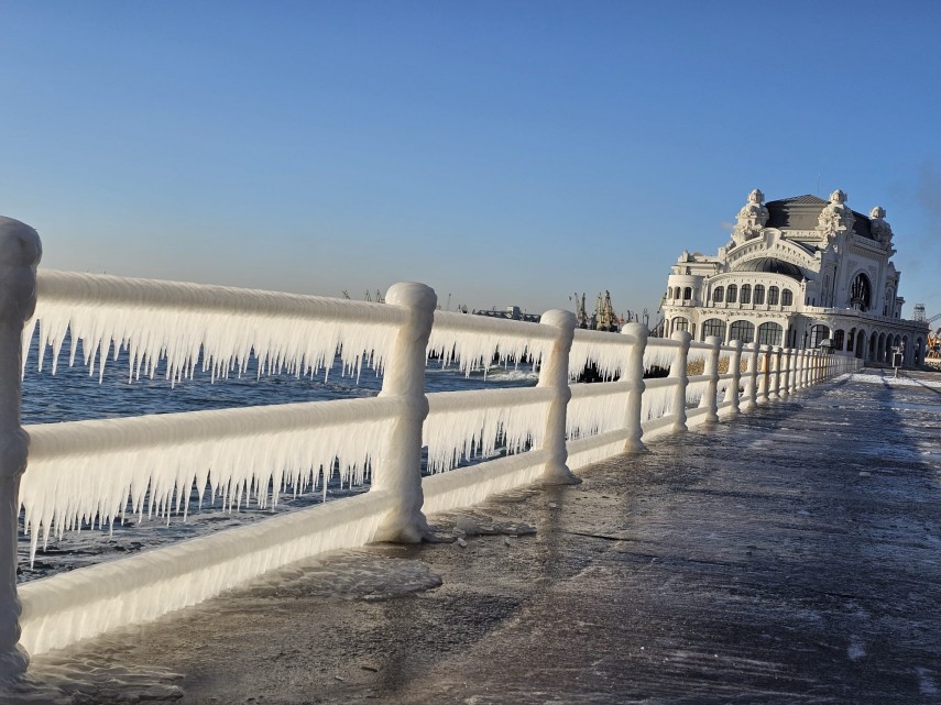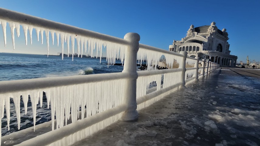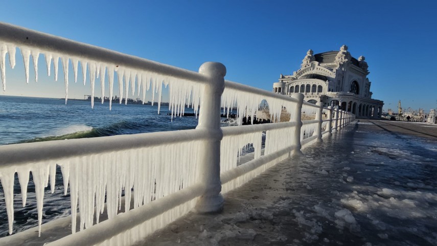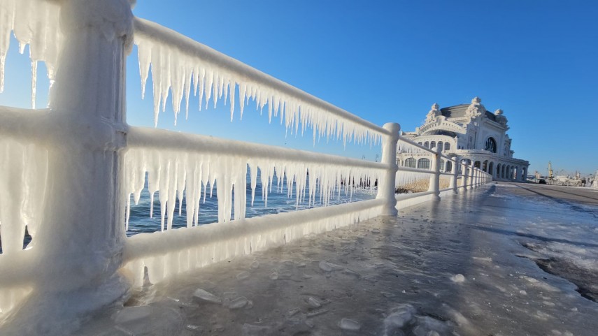 FOTO+VIDEO Imagine spectaculoasă la malul mării! Faleza Cazinoului, acoperită de gheață și țurțuri