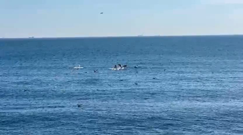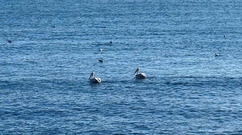 Astăzi, 31 octombrie 2025, trecătorii din zona Cazinoului din Constanța au avut parte de un moment spectaculos: mai mulți pelicani au fost observați plutind pe valurile liniștite ale Mării Negre, în apropierea falezei.