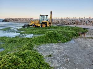 În urma ciclonului care a lovit recent litoralul românesc, plajele din Mamaia au fost acoperite de cantități mari de alge aduse de valurile puternice.