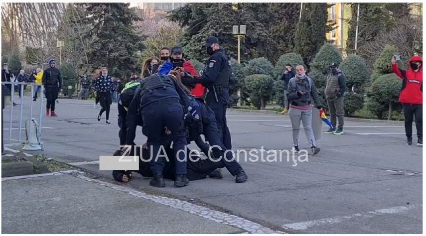 În tot acest timp câțiva dintre colegii săi, participanți la mitingul de protest împotriva măsurilor impuse de Guvern pentru limitarea răspândirii covidului, căutau să explice, foarte vocali, jandarmilor și celor prezenți că totul este un abuz și că asupra celui pus la pământ sunt exercitate presiuni fizice și psihice.