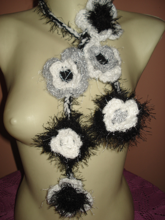 Colier alb-negru crosetat cu fir acril si fir efect.