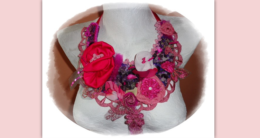 2. Colier Fuchsia - colier generos realizat din materiale pretioase precum matasea naturala,voalul,satinul, dantela,tulle si decorat cu ametiste,sidef si margele de nisip.