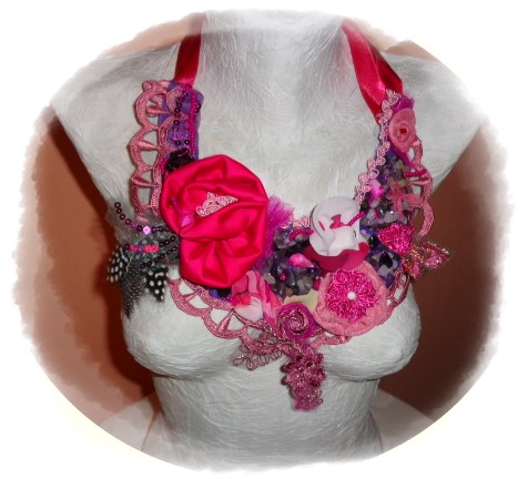 1. Colier, Fuchsia" realizat dintr-un mix de materiale preţioase precum mătasea naturală, dantelă, voalul precum şi ametiste, sidef şi mărgele de nisip.