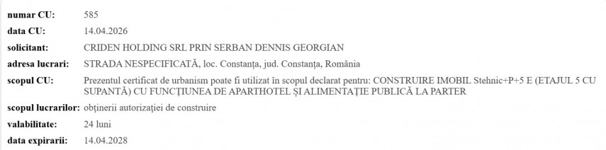 Primăria municipiului Constanța a emis Certificatul de Urbanism nr. 585, datat 14 aprilie 2026, la solicitarea companiei Criden Holding SRL, reprezentată de fostul fotbalist român Șerban Dennis Georgian.