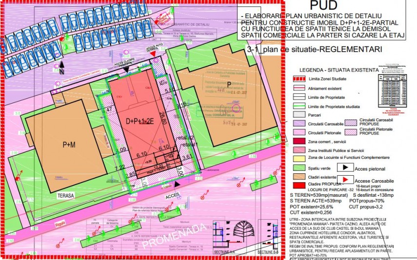 Terenul la care se face referire în prezenta documentaţie se găseşte în zona de nord a municipiului Constanţa, având următorii vecini: la sud - promenadă, proprietate a municipiului Constanţa, la nord - alee pietonală şi parcare; la est - alee pietonală şi terasa nr. 17, iar la vest - alee pietonală şi terasa nr. 14. În imobilul propus prin PUD se doreşte amenajarea a 21 de camere de cazare (42 de locuri de cazare) în regim hotelier şi a unui spaţiu comercial (restaurant) cu suprafaţa utilă de maximum 250 mp şi 80 de locuri la masă. De asemenea, este nevoie de 32 de locuri de parcare, conform HGR. nr. 525/1996, după cum urmează: opt locuri de parcare pentru restaurant şi 16 locuri de parcare pentru camerele în regim hotelier.