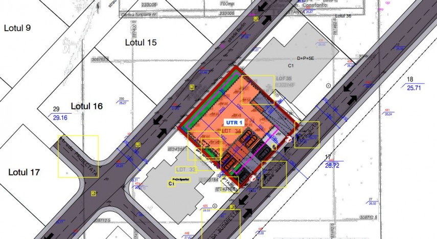 Indicatorii urbanistici maximi aprobaţi sunt: regimul de înălţime maxim - P+4E (maximum 16 metri), POT - maximum 60%, CUT maxim - 3%. Amplasamentul beneficiază de acces facil din arterele importante de circulaţie din zonă: bulevardul Tomis, strada Budapesta. Accesul carosabil la teren se va face prin intermediul străzii Budapesta, strada propusă spre extindere prin HCL 121/16.05.2011. Strada are 10 metri: două sensuri, fiecare cu câte o bandă de mers pe fiecare sens cu lăţime de 3,5 metri şi trotuare de câte 1,5 metri pe fiecare parte a străzii. Respectând HCLM 113/2017, pentru 18 apartamente cu suprafaţa utilă mai mică de 100 mp şi un spaţiu comercial cu suprafaţa utilă mai mică de 50 mp s-au propus 26 de locuri parcare în subsolul imobilului şi la nivelul solului, în incintă.