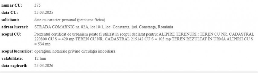 Pe 25 martie 2025, Primăria Constanța a emis Certificatul de Urbanism nr. 375 pentru un solicitant persoană fizică, având ca obiect alipirea a două terenuri situate pe strada Comarnic nr. 82A, lot 10/1, în municipiul Constanța. Potrivit documentului emis, procedura presupune unificarea a două suprafețe de teren: