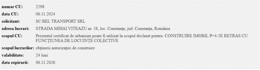 Pe 6 noiembrie 2024, SC Bel Transport SRL a obținut, de la Primăria Constanța, certificatul de urbanism cu numărul 2598 pentru realizarea unui nou proiect rezidențial situat pe strada Mihai Viteazu nr. 58 din Constanța.