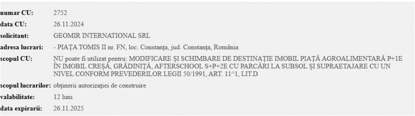 Reamintim că Primăria Constanța a mai eliberat un act de urbanism societății Geomir International SRL. Pe data de 14 august, Municipalitate a emis certificatul de urbanism nr. 2075 care constă în: NU poate fi utilizat pentru Modificare și schimbare de destinație imobil Piață Agroalimentară P+1E în imobil clinică medicală centru îngrijire bătrâni S+P+2E cu parcări la subsol și supraetajare cu un nivel conform prevederilor Legii 50/1991, art. 11^1, lit.D“. Certificatul de urbanism nr. 2075 este valabil 12 luni.