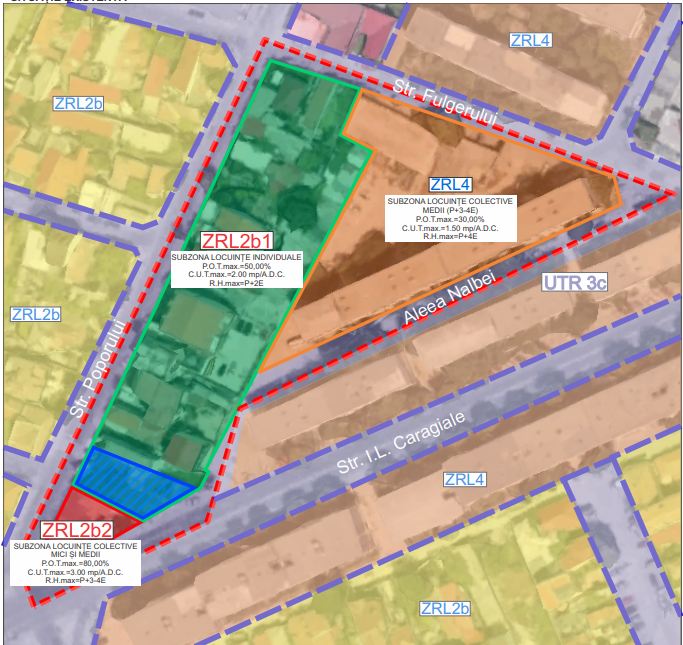 documentaţiei de urbanism şi va fi delimitată astfel: la Nord - strada Fulgerului; la Vest - strada Poporului; la Est - aleea Nalbei; la Sud - strada Ion Luca Caragiale. Terenul propus pentru studiu este situat în intravilanul municipiului Constanta, în zona centrală, cartier Coiciu, la vest de bulevardul 1 Decembrie 1918, în proximitatea Casei de Cultură şi a Cimitirului Ortodox Central. Terenul identificat cu numărul cadastral 245359 este în proprietatea privată a SC Elys Interdecor SRL, conform contractului de vânzare-cumpărare. Suprafaţa terenului este de 422 mp şi dispune de acces direct din două circulaţii carosabile: 13,88 m din strada Poporului şi 18,21 m din strada I. L. Caragiale. Terenul prezintă împrejmuire şi este liber de construcţii. Conform extrasului de carte funciară, terenul are destinaţia de curţi construcţii. Potrivit P.U.G. aprobat prin HCL nr.653 din 24.11.1999, din zona studiată de aproximativ 13.200 mp, aproximativ 6.600 mp fac parte din U.T.R. ZRL4 - Subzona locuinţelor colective medii cu P+3 - 4 niveluri, situate în ansambluri preponderent rezidenţiale, cu următoarele specificaţii şi indicatori urbanistici: locuinţe în proprietate privată şi locuinţe sociale, construcţii aferente echipării tehnico-edilitare, amenajări aferente locuinţelor (căi de acces carosabile şi pietonale private, parcaje, garaje, spaţii plantate, locuri de joacă pentru copii, amenajări de sport pentru tineret, împrejmuiri). Procentul de utilizare a terenului este de 30%, iar coeficientul de utilizare a terenului este de 1,50 mp, înălţimea maximă admisibilă a clădirilor e de