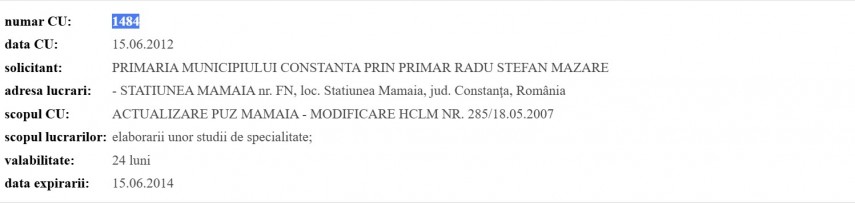 - Certificatul de Urbanism vechi: Acea hotărâre a fost fundamentată pe CU nr. 1484 din 15.06.2012, solicitat la acea vreme tot de Primăria Municipiului Constanța, sub semnătura lui Radu Mazăre.
