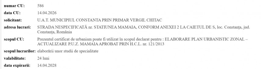 Astăzi, a fost emis un nou certificat de urbanism (CU nr. 586 din 14.04.2026) în scopul actualizării Planului Urbanistic Zonal (PUZ) al stațiunii Mamaia.