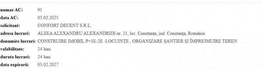 Mai exact este vorba despre Autorizația de Construire nr. 91, care costă în: Construire imobil P+1e-2e -locuințe, organizare șantier și împrejmuire teren. Proiectul imobiliar va fi realziat pe Aleea Alexandru Alexandridi nr. 21, Constanța.