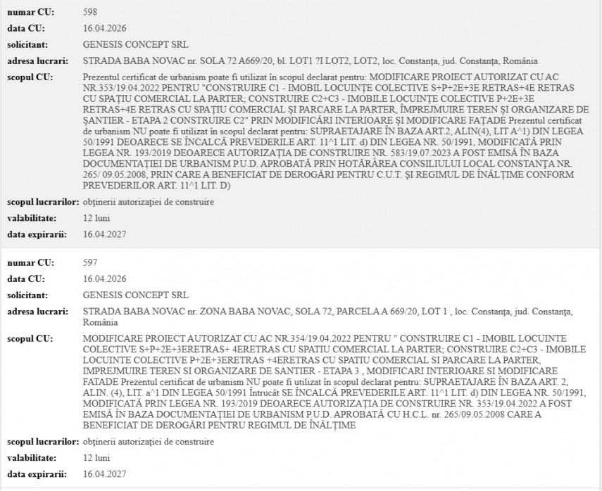 De asemenea, Certificatul de Urbanism nr. 597, datat 16 aprilie 2026, la solicitarea companiei Genesis Concept SRL vizează un teren de pe strada Baba Novac din Constanța și permite inițierea demersurilor pentru modificare proiect autorizat cu AC NR.354/19.04.2022 pentru " construire C1 - imobil locuinte colective S+P+2E+3E RETRAS+ 4E retras cu spatiu comercial la parter; construire C2+C3 - imobile locuinte colective P+2E+3E retras +4E retras cu spatiu comercial si parcare la parter, imprejmuire teren si organizare de santier - etapa 3, modificari interioare si modificare fatade