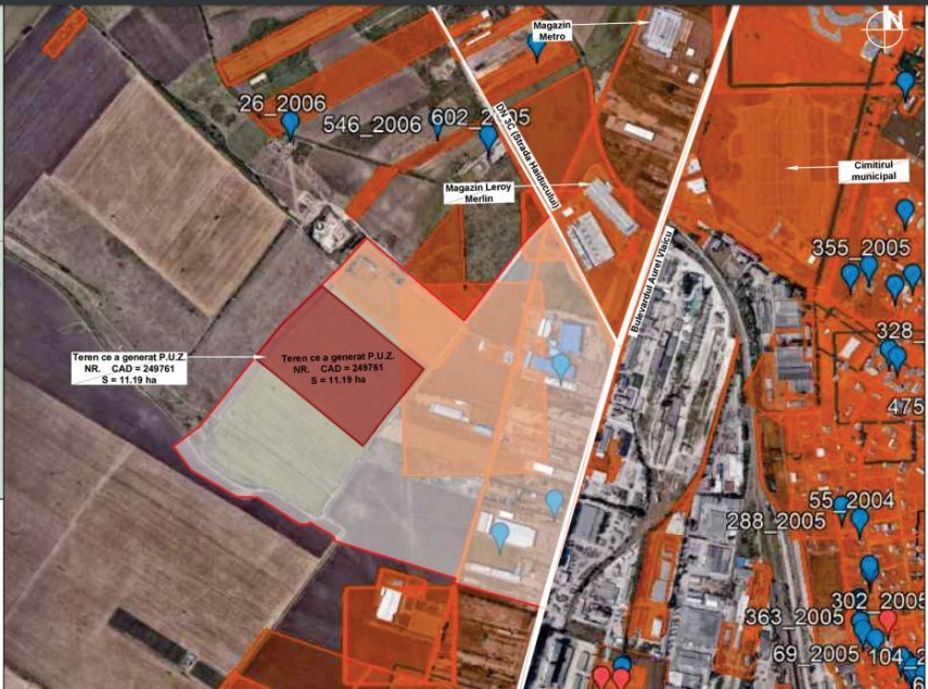 Suprafața totală a terenului ce a generat prezenta documentație este de 115.982 mp/ 11.5982 ha, conform extrasului de carte funciară nr. 249761, eliberat sub numărul 152069 / 23.11.2018, și prezintă următoarele vecinătăți: la sud-est - drum de exploatare DE 633, propus spre modernizare, la sud-vest - parcela cu nr. cad. 210991, la nord-est - parcela cu nr. cad. 214609, iar la nord-vest - parcela cu nr. cad. 247987. Având în vedere prevederile Legii 350 /2001, se va studia unitar și coroborat o zonă mult mai mare, ce va face studiul documentației de urbanism, în suprafață aproximativă de 873677 mp / 87.36 ha, și va fi delimitată astfel: la est - bulevardul Aurel Vlaicu, intravilan, la sud-vest - drum de exploatare 644 în extravilan, parcela cu nr. cad. 243194, drum de exploatare, parcela cu nr. cad. 205873, la nord-est - drum de exploatare DE 634/2, drum DN 3C (strada Haiducului), la nord-vest - drum de exploatare DE 633 propus spre modernizare, drum de exploatare aflat in extravilan.