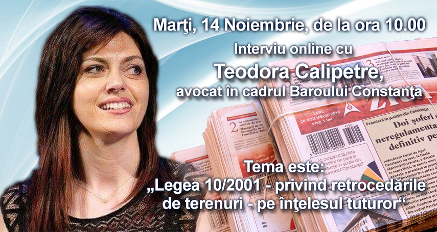 Teodora Calipetre, avocat în cadrul Baroului Constanţa, va explica pe înţelesul tuturor Legea 10/2001, privind retrocedările de terenuri! Totul va avea loc marți, 14 noiembrie, de la ora 10.00, în cadrul unui interviu acordat pentru ZIUA de Constanța.