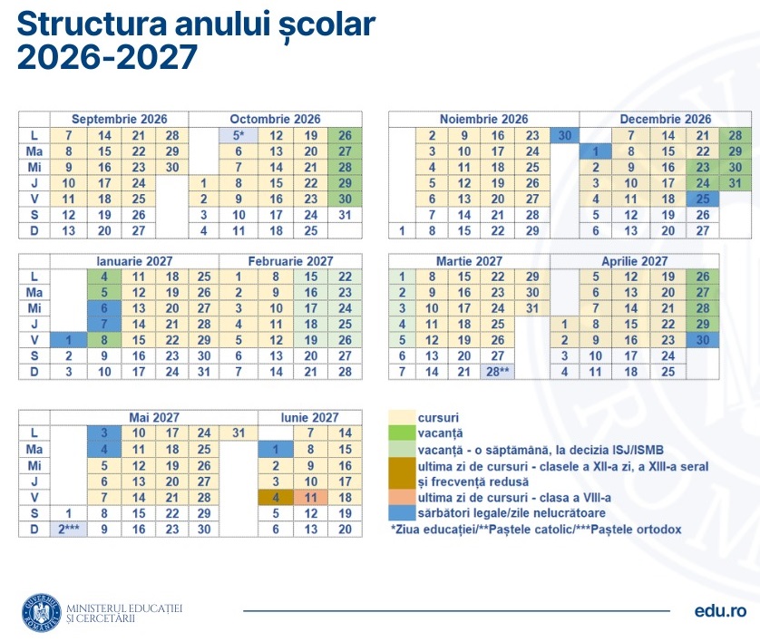 Ordinul care aprobă structura anului școlar 2026 - 2027 va fi disponibil pe site-ul Ministerului Educației și Cercetării după publicarea în Monitorul Oficial.