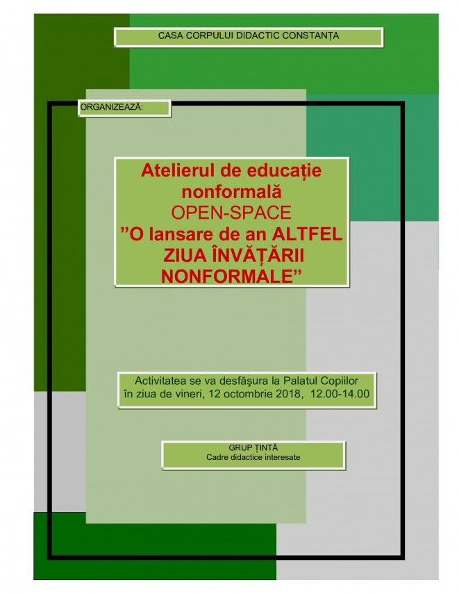 Activitatea, realizată sub forma unui Open Space (Tehnologia Spaţiului Deschis), va marca Ziua Învățării Nonformale şi se va derula între orele 12.00 - 14.00. La eveniment sunt aşteptaţi responsabilii de dezvoltare profesională din judeţul Constanţa şi toate cadrele didactice interesate de alegerea unui curs corespunzător nevoilor de formare proprii în anul şcolar 2018-2019.