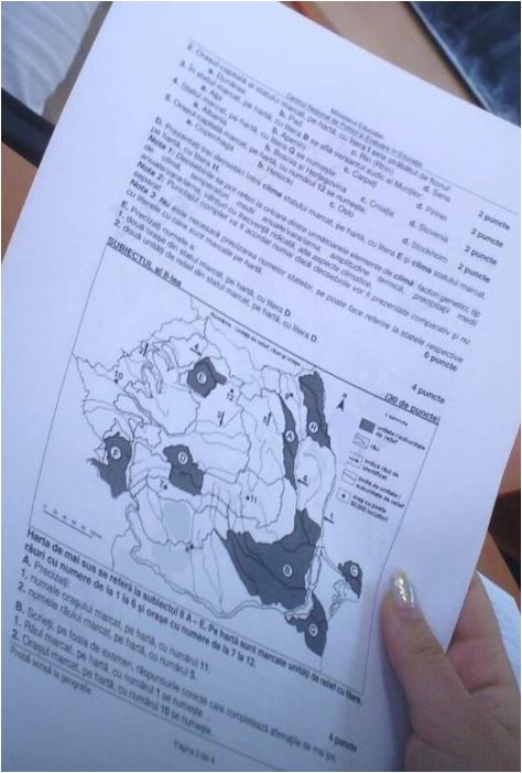 La al doilea subiect au primit harta României, unde au avut de rezolvat încă 13 exerciții pe baza marcajelor. Candidații la Geografie BAC 2024 au avut de numit orașe, râuri, unități de relief. Li s-au dat și cinci grile cu o singură variantă de răspuns.