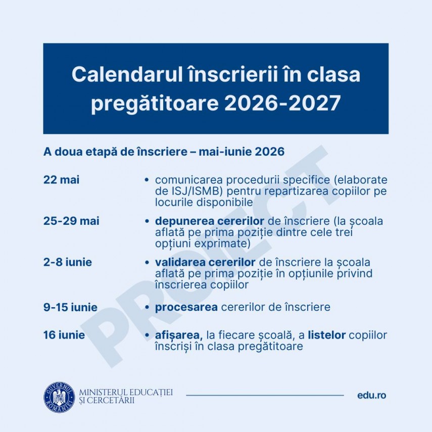 Calendarul pentru înscrierea în clasa pregătitoare în anul școlar 2026 - 2027, în consultare publică
