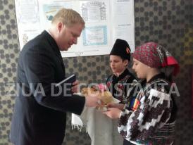 Invitaţii au fost primiţi de doi fraţi, băiat şi fată (gemeni), îmbrăcaţi în costume populare, care le-au oferit vestita pâine cu sare. Ronald E. Hawkins Jr. a stat de vorbă cu elevii şcolii. El le-a explicat acestora, pe înţelesul lor, ce este ambasada şi ce atribuţii are.