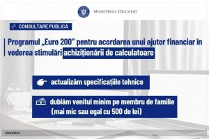Reamintim că programul „Euro 200” se derulează începând cu anul 2004, în baza Legii nr. 269/2004, obiectivele sale fiind stimularea achiziţionării de computere prin acordarea unor ajutoare financiare stabilite pe criterii sociale, respectiv crearea de competenţe în utilizarea mijloacelor IT & C. Ajutorul financiar reprezintă echivalentul în lei a 200 de euro pentru un computer, calculat la cursul de schimb valutar comunicat de Banca Naţională a României pentru ultima zi a lunii precedente, fără a depăşi valoarea computerului achiziţionat. Ajutorul se acordă o singură dată în cadrul unei familii. Configuraţia minimă recomandată a calculatoarelor pentru achiziţionarea cărora se acordă sprijinul financiar este următoarea: procesor 2 Ghz, 1 GB RAM si 250 GB hard-disk şi software de bază licenţiat, incluzând un sistem de operare şi un program antivirus. În cei 14 ani de aplicare a programului „Euro 200”, au beneficiat de sprijin pentru achiziţia de computere peste 297.000 de elevi şi studenţi.
