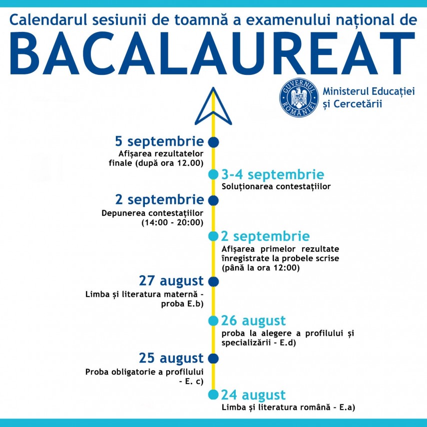 Afișarea primelor rezultate înregistrate la probele scrise va avea loc în data de 2 septembrie (până la ora 12:00) și va fi urmată de etapa depunerii contestațiilor, în aceeași zi, în intervalul orar 14:00 - 20:00.